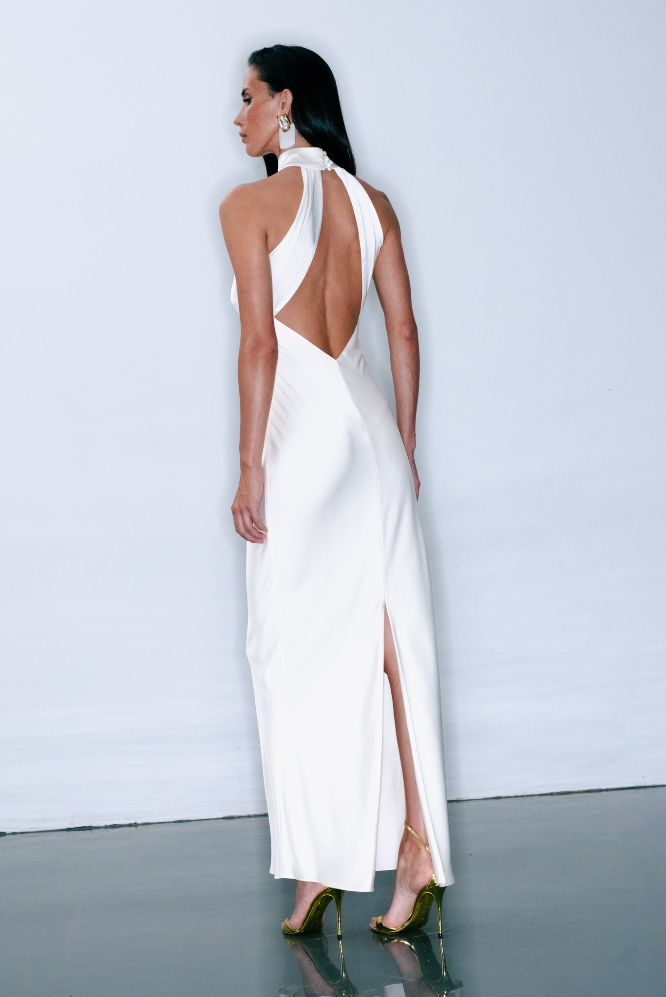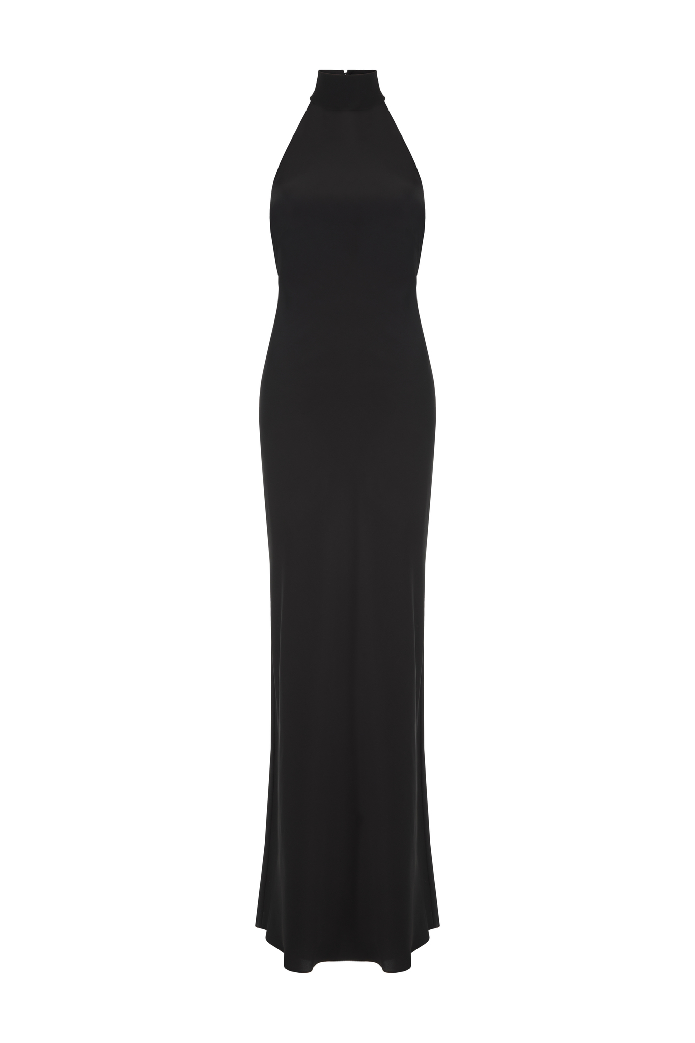 Это платье макси из блестящего атласа имеет гладкий косой силуэт с высоким воротником и открытой спиной. Наденьте эффектные туфли-лодочки и клатч, чтобы создать шикарный вечерний образ.